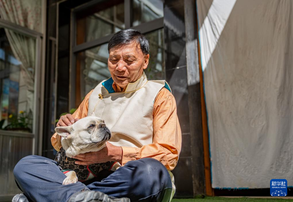 2024年3月28日 普次仁在家中和小狗玩耍(3月23日摄)。