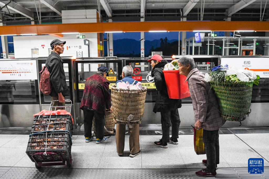 3月27日清晨,渝北区石船镇角口村村民背着蔬菜,前往重庆轨道交通4号线二期石船站乘车。