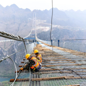 从峡谷里径直吹来的风,在耳旁呼啸而过,脚下是600多米深的花江大峡谷,建桥工人们紧了紧身上的安全绳,继续抓紧对大桥施工猫道防护网进行加固……这里,是位于贵州安顺市关岭县与黔西南州贞丰县接壤处的花江峡谷大桥建设现场。