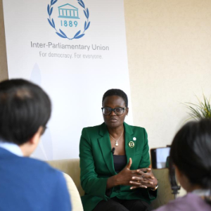 3月27日,各国议会联盟主席图利娅·阿克松在瑞士日内瓦接受新华社记者专访。