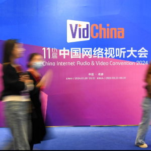 3月28日,参会者从第十一届中国网络视听大会开幕式会场外的展板前走过。