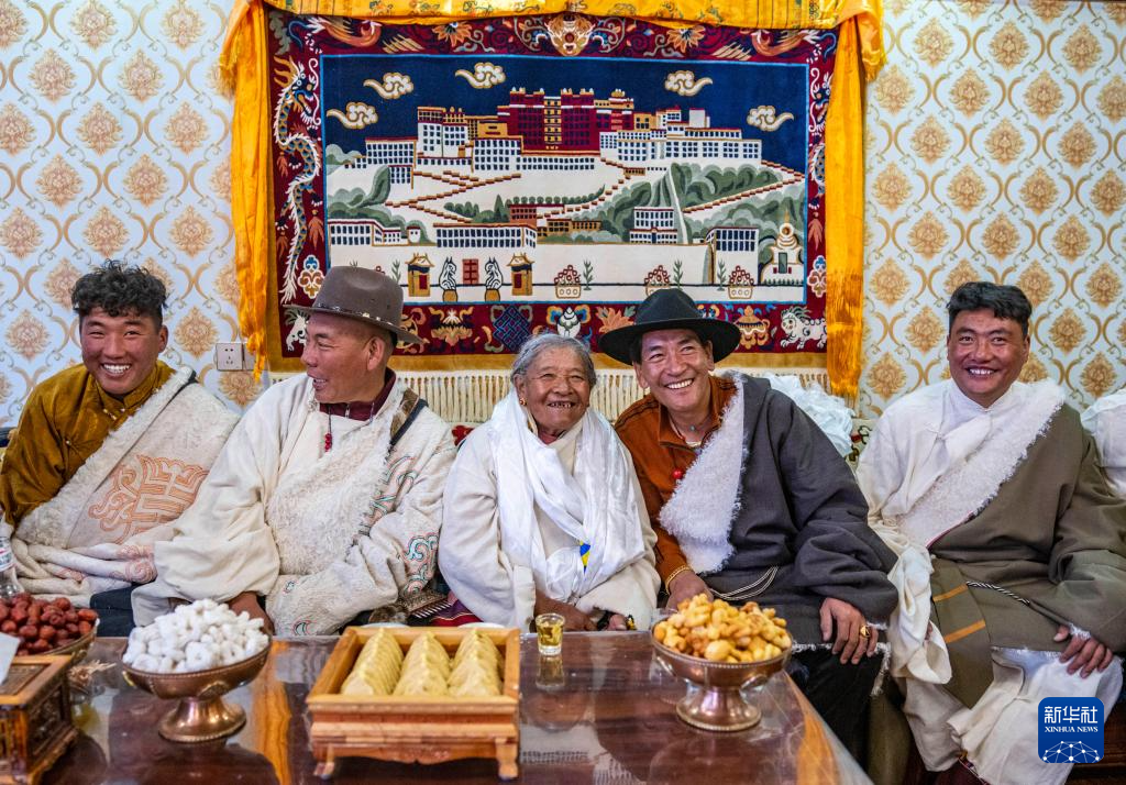 2024年藏历新年,斯曲旺姆的儿女们带着各自的小家庭来甲根村团聚,孩子们依次给老人献上哈达、敬上青稞酒。斯曲旺姆被满堂儿孙围坐中间,欢歌笑语回荡在明亮宽敞的客厅里。