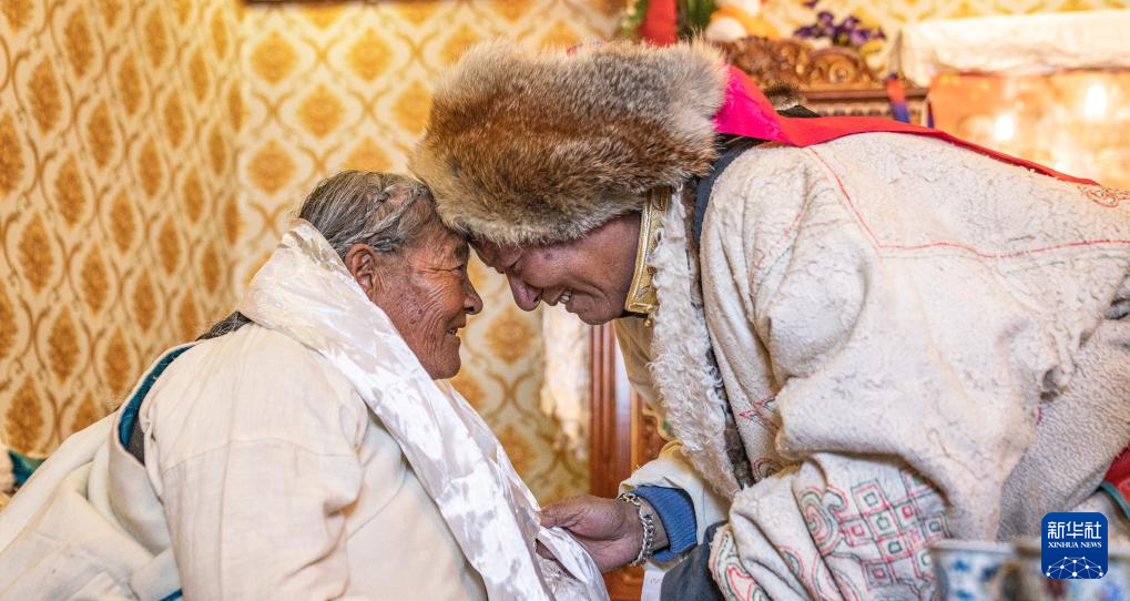 在位于拉萨市当雄县公塘乡甲根村的家中,斯曲旺姆(左)和家人行碰头礼(2月10日摄)。