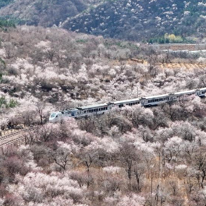 近日,北京居庸关长城脚下的山花渐次开放。北京市郊铁路S2线列车穿行于花海间,成为春日里一道美丽的风景,吸引不少游人前来赏春。