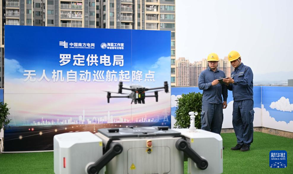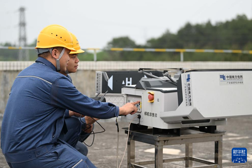 3月28日,在南方电网广东云浮供电局220千伏黎少变电站的无人机自动巡航起降点,蓝誉鑫(前)和同事检查无人机设备。