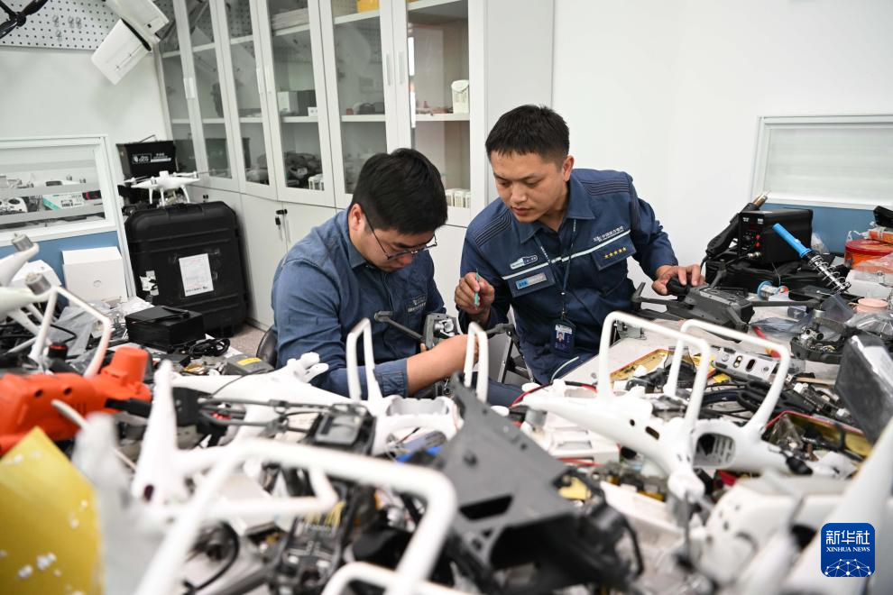 3月28日,在南方电网广东云浮罗定供电局的海蓝工作室,蓝誉鑫(右)和同事一起修理无人机。