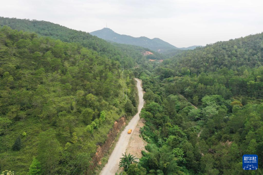 3月28日,在广东云浮罗定市长岗坡周边山区,蓝誉鑫和同事驾车在山区巡线(无人机照片)。