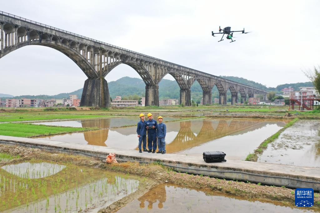 3月28日,在广东云浮罗定市长岗坡,蓝誉鑫(中)和同事操控无人机起飞巡线。
