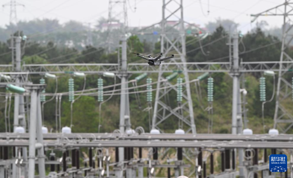 3月28日,在南方电网广东云浮供电局220千伏黎少变电站,蓝誉鑫操控的无人机在巡线。