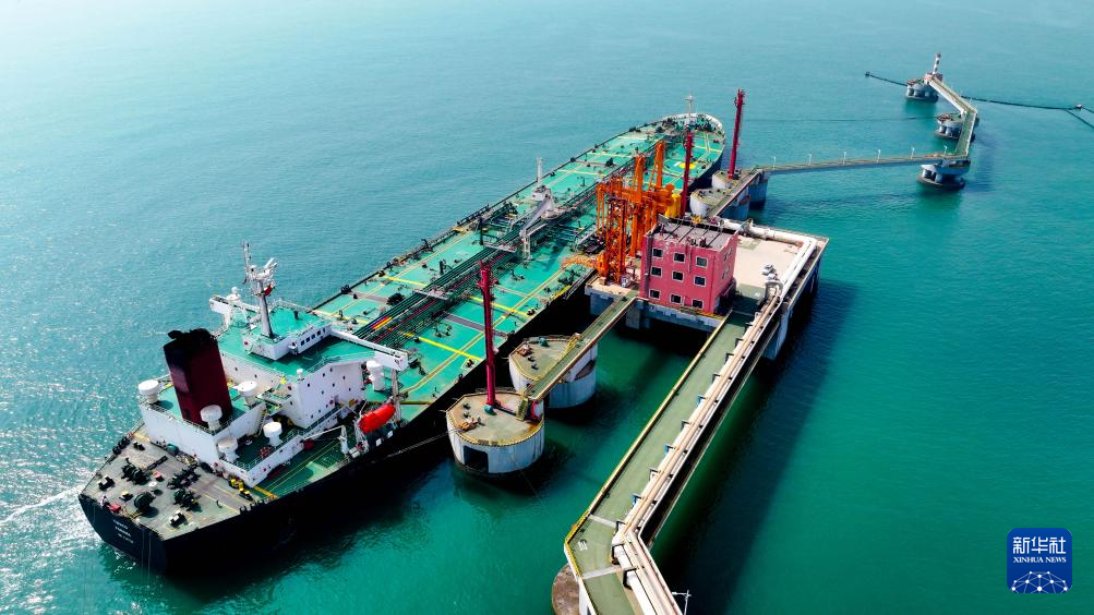 3月29日,在山东港口日照港岚山港区30万吨级油品码头,船舶停靠进行卸油作业(无人机照片)。