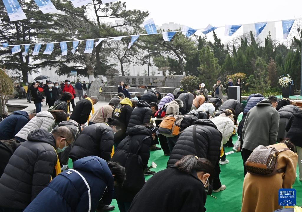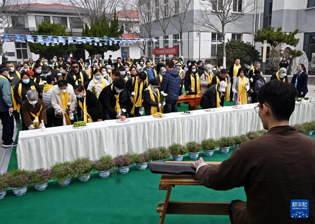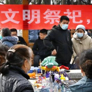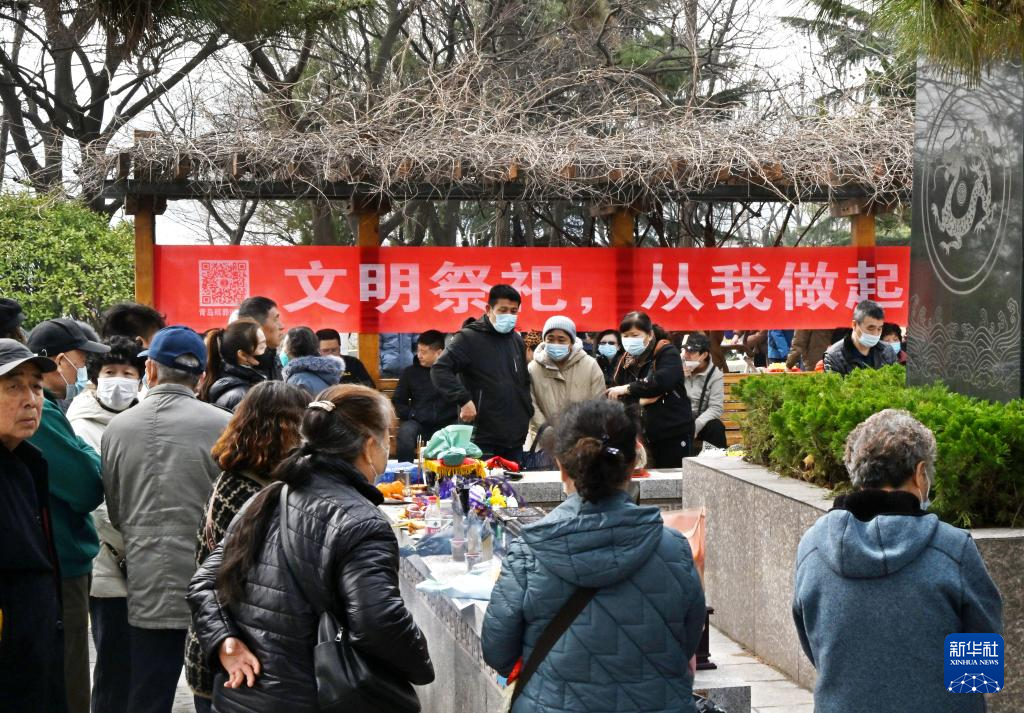 3月28日,市民在青岛市殡仪馆文明祭奠区参加集体祭扫活动。