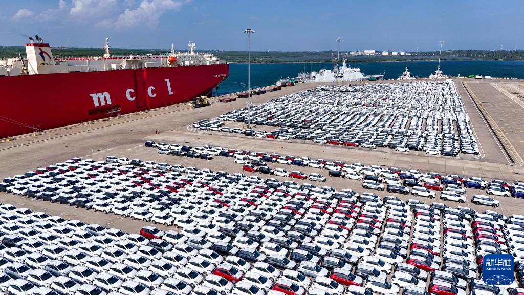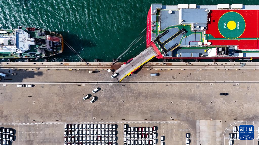 3月28日,在斯里兰卡汉班托塔港,滚装船卸运汽车(无人机照片)。
