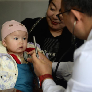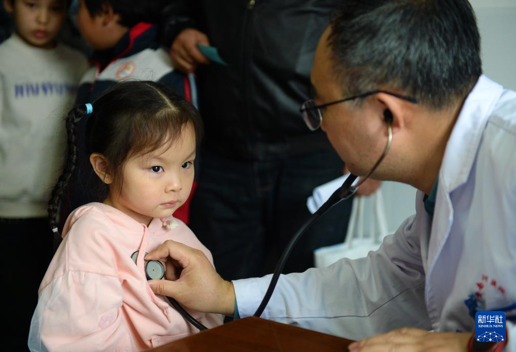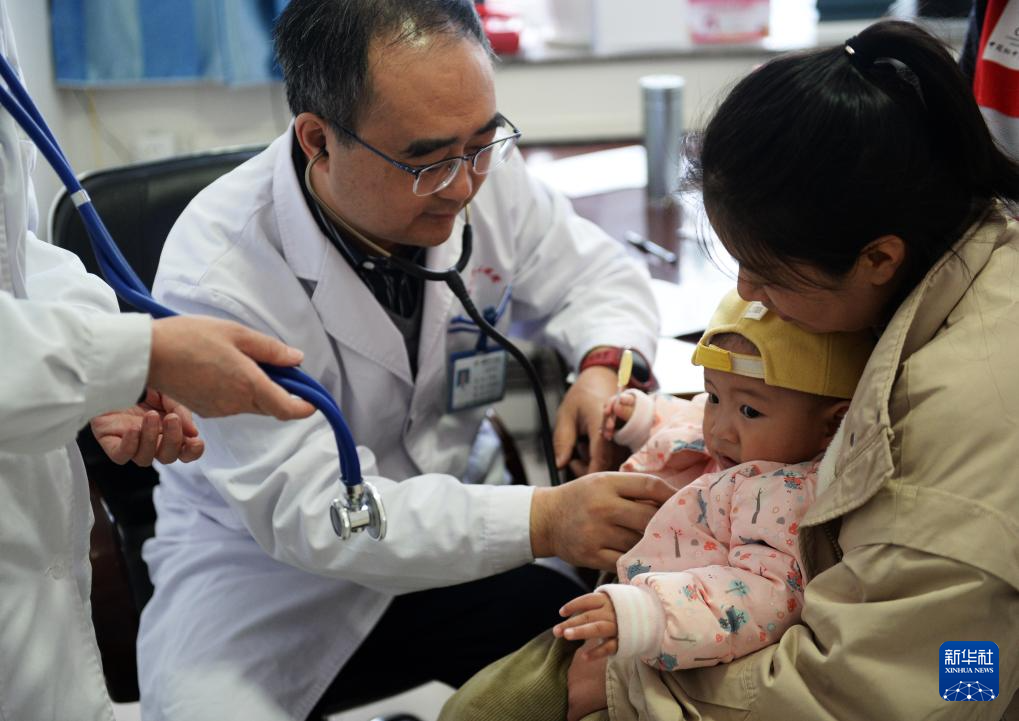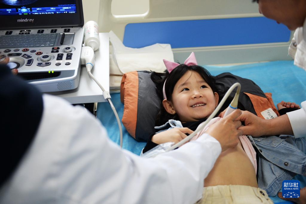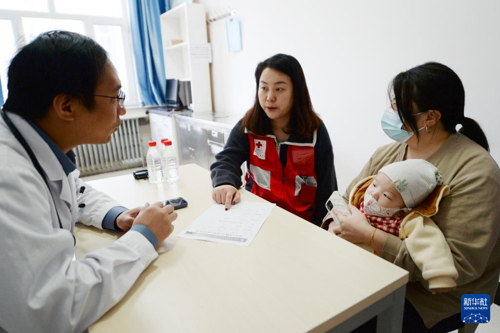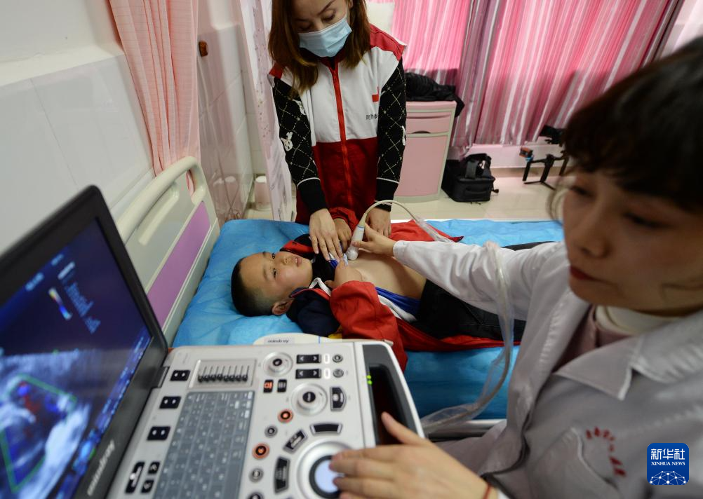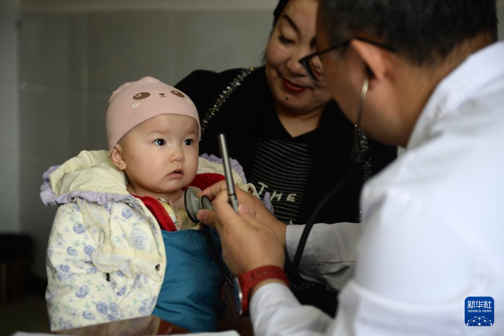 3月26日,在阿勒泰市妇幼保健院,济南市中心医院的医疗专家在给孩子做检查。