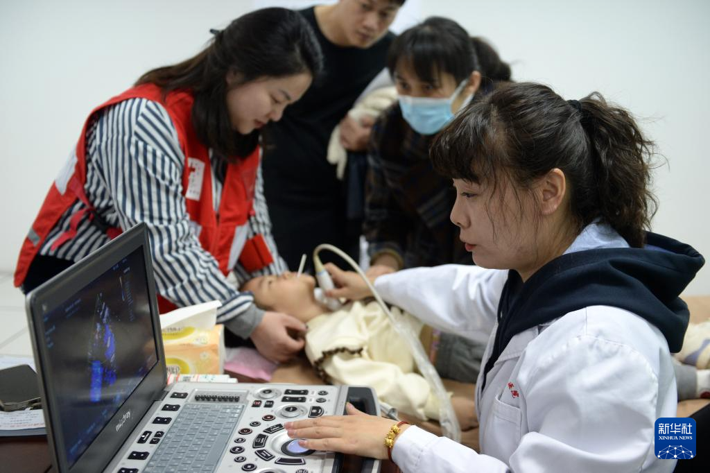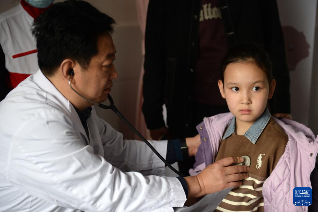3月28日,在塔城地区人民医院,济南市中心医院的医疗专家在给孩子做检查。