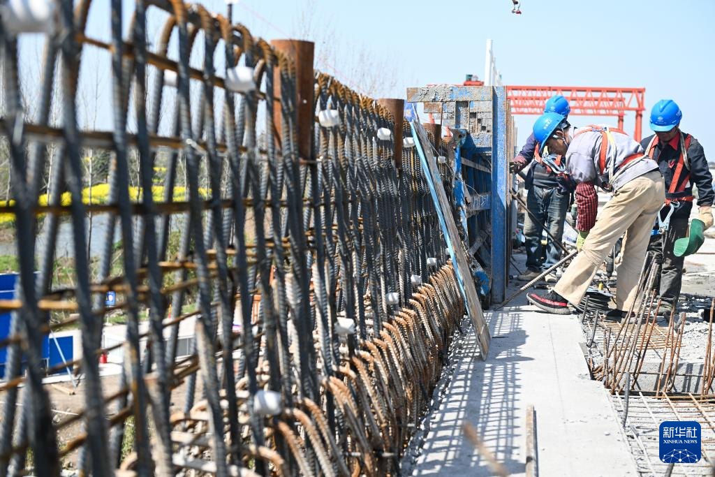 3月29日,工人在沪陕高速公路平潮至广陵段扩建工程施工现场作业。