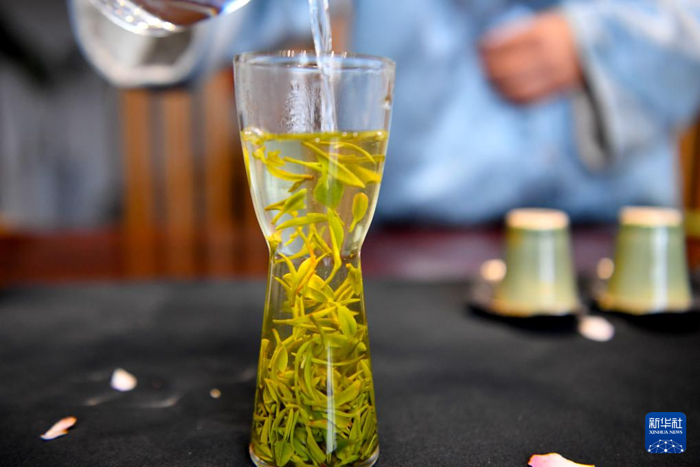 3月27日,在河南省信阳市浉河区土门村,肖珺景在冲泡信阳毛尖茶。