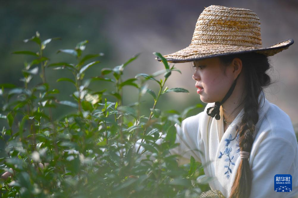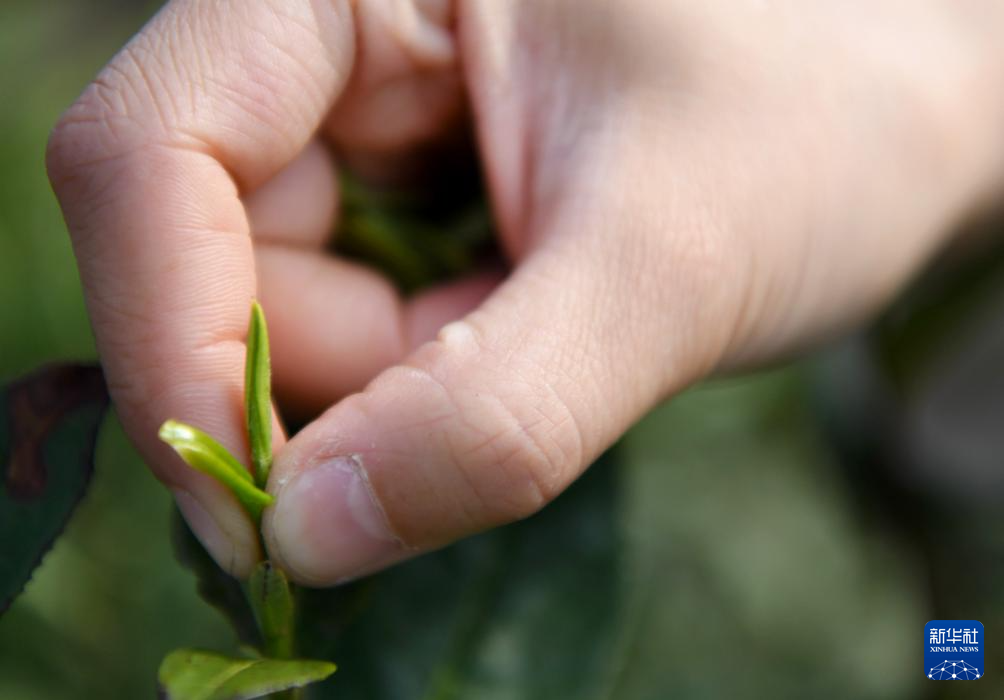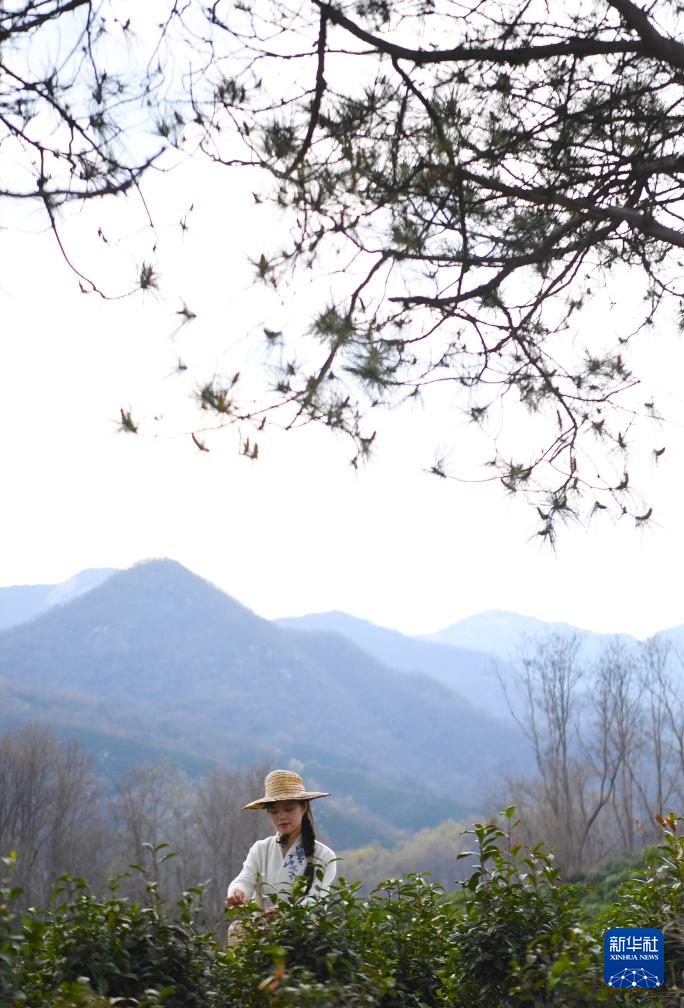 3月26日,肖珺景在河南省信阳市浉河区的茶园内采茶。