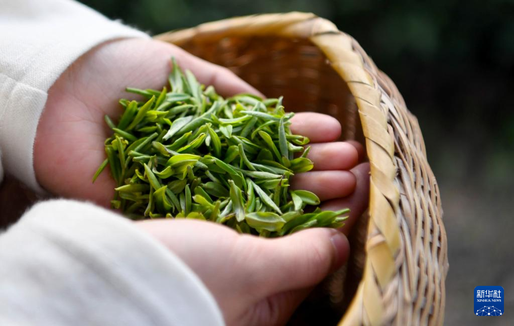 3月26日,在河南省信阳市浉河区的茶园内,肖珺景展示刚刚采摘的茶鲜叶。