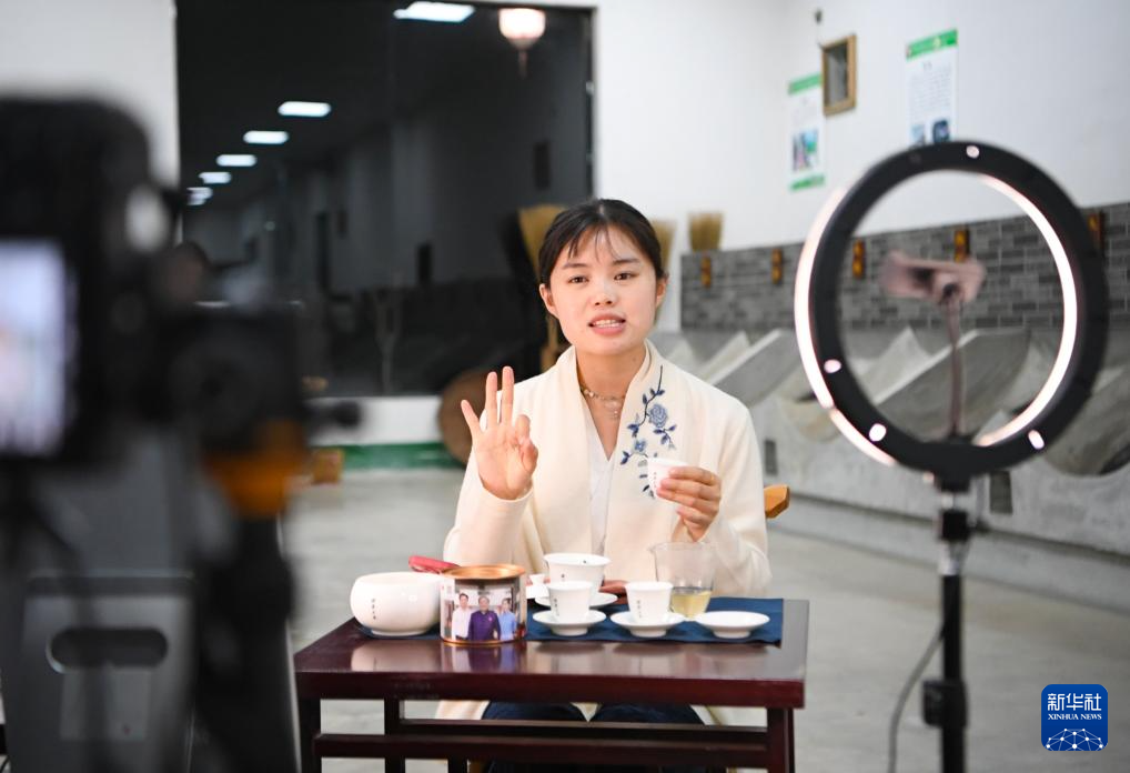 3月26日,在河南省信阳市浉河区土门村,肖珺景在网络平台直播推广茶文化。