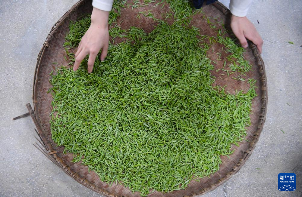 3月26日,在河南省信阳市浉河区土门村,肖珺景在整理茶鲜叶。