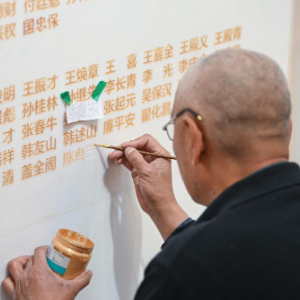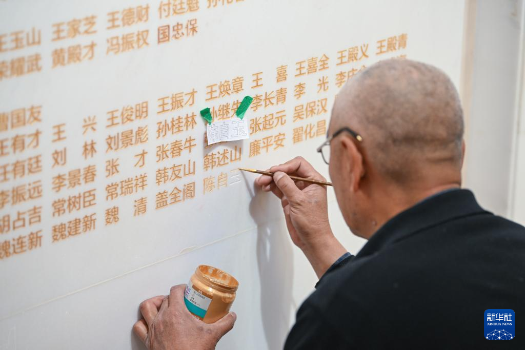 3月29日,在平津战役纪念馆,工作人员为新确认的烈士刻名描金。