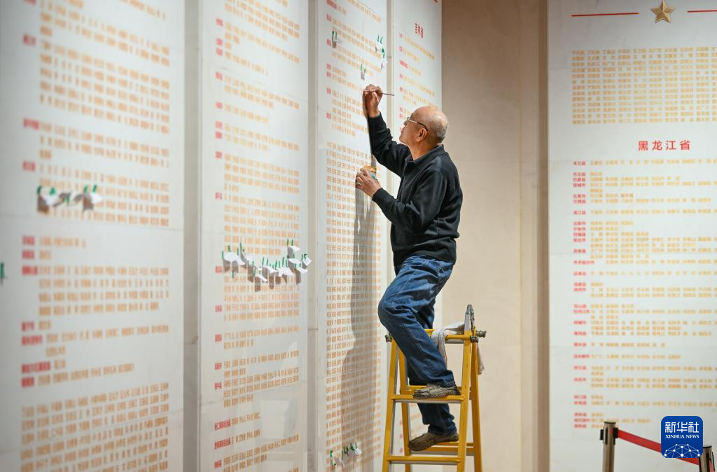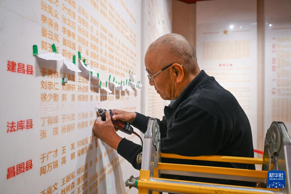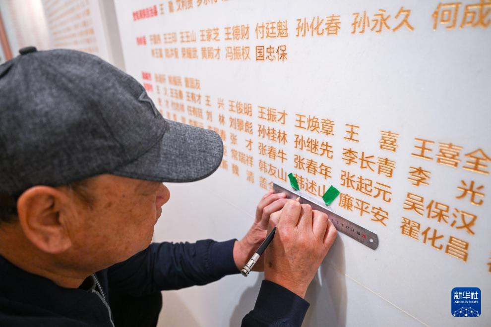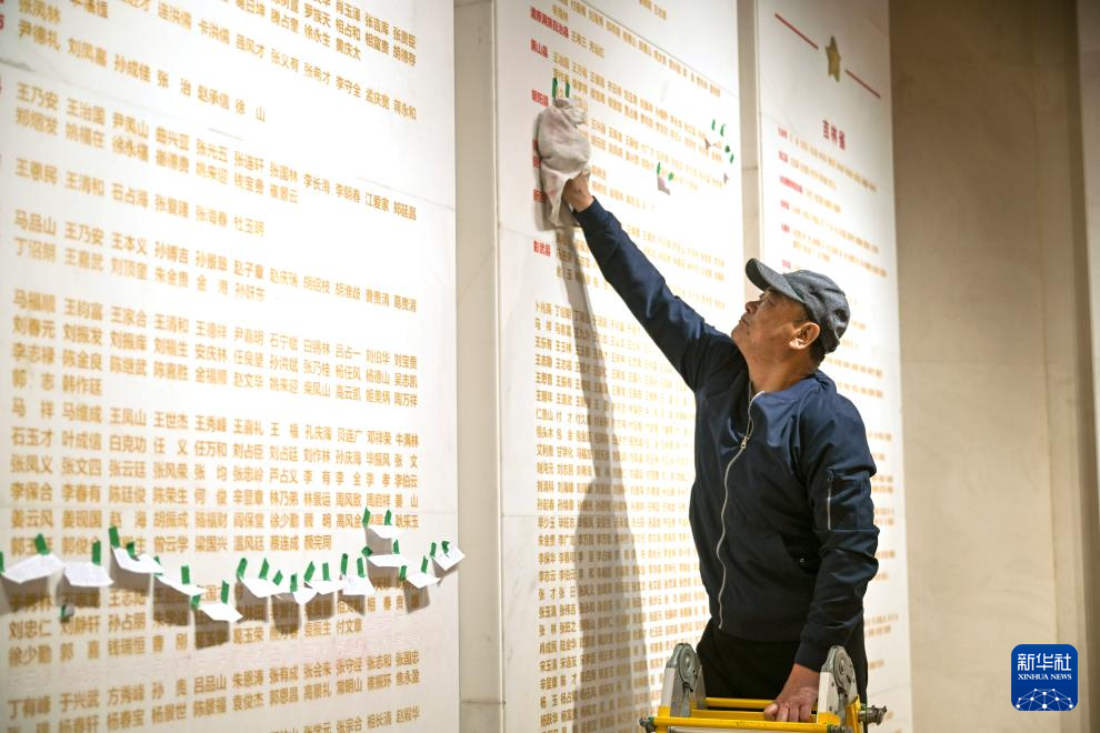 3月29日,在平津战役纪念馆,工作人员准备将新确认的烈士姓名刻在烈士墙上。