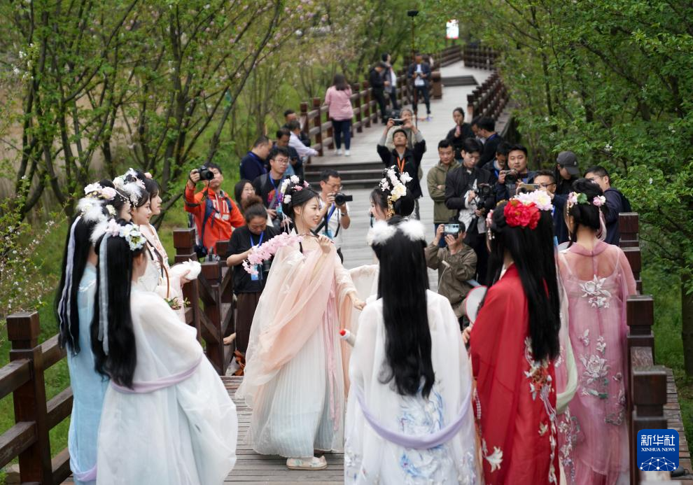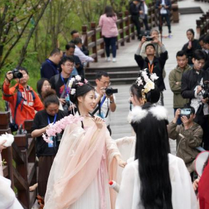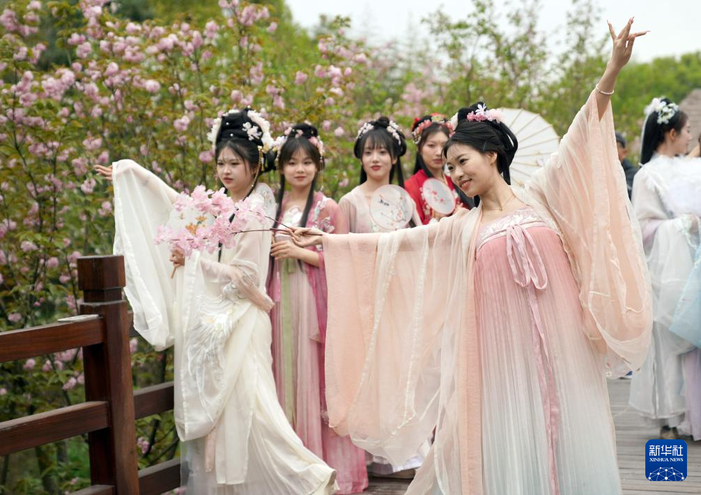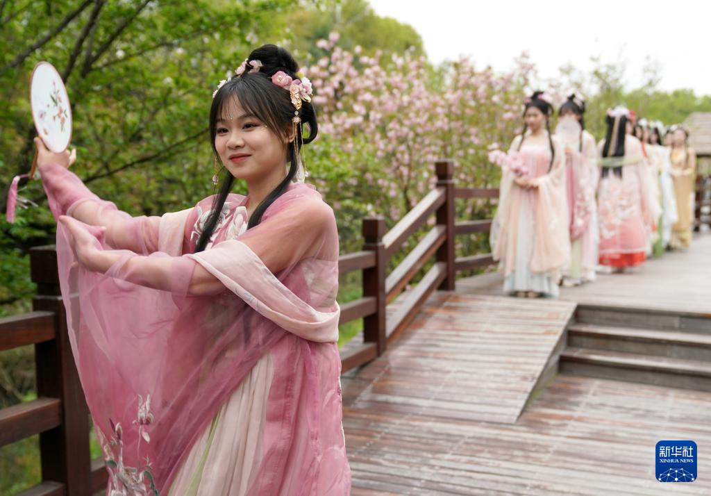 当日,浙江省丽水市莲都区古堰画乡景区,10多名汉服爱好者在樱花栈道上进行汉服表演,吸引游客打卡拍照。