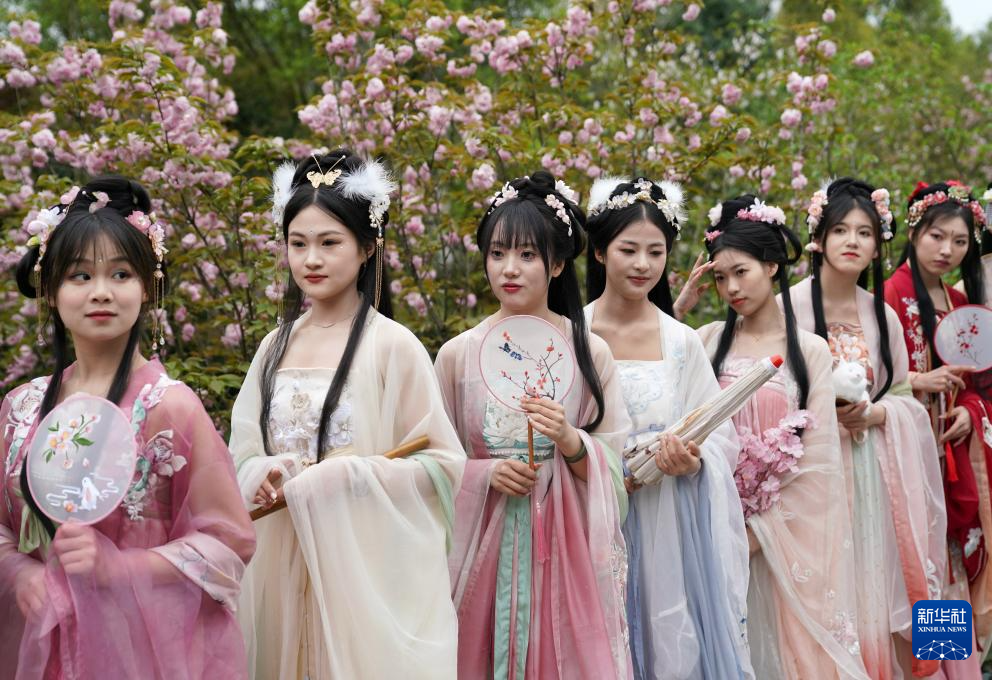 3月30日,浙江省丽水市的汉服爱好者在古堰画乡景区樱花栈道上进行汉服表演。