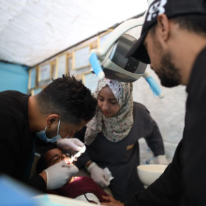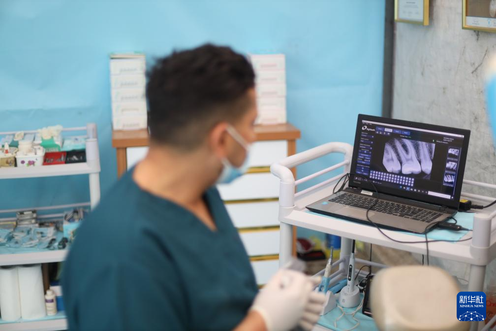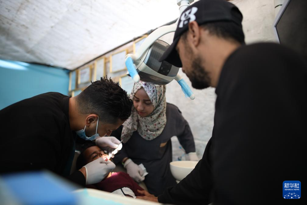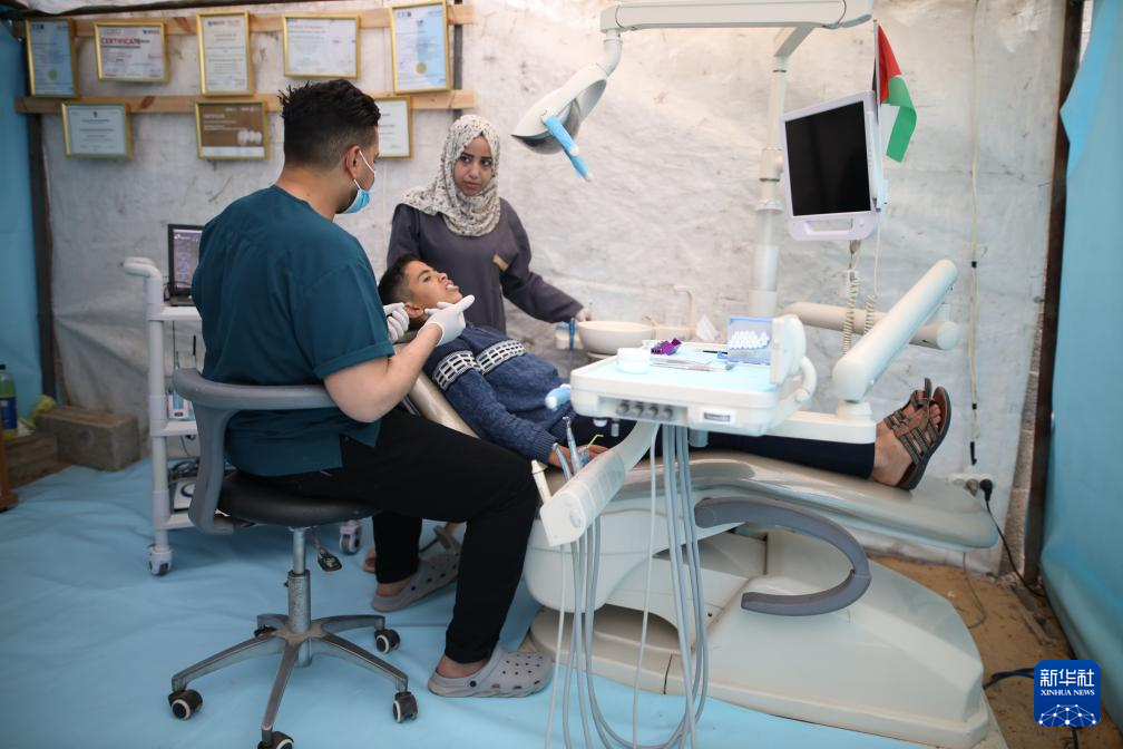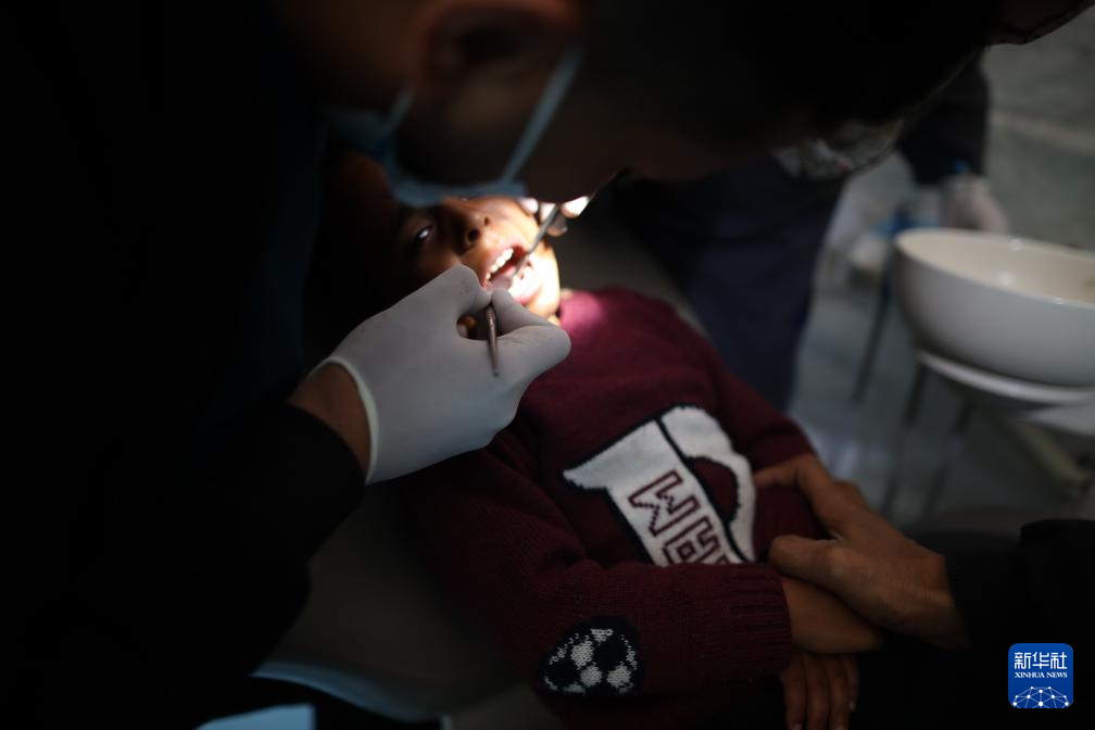 3月30日,在加沙地带的一家临时诊所,牙科医生为患者看病。