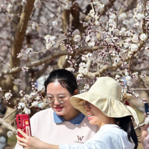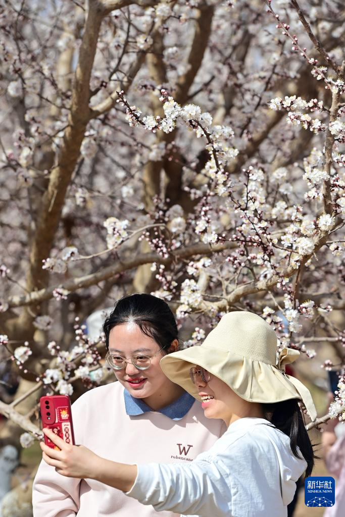 3月30日,在库车市牙哈镇托克乃村小白杏示范田,游客在杏园打卡拍照。