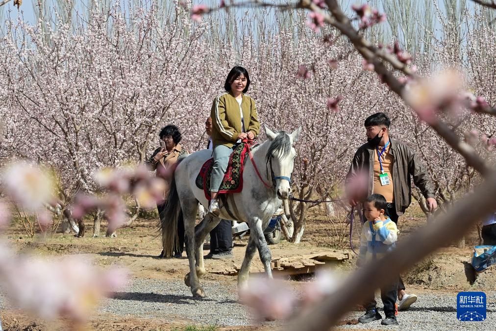 3月30日,在库车市牙哈镇托克乃村小白杏示范田,游客在杏园骑马赏花。