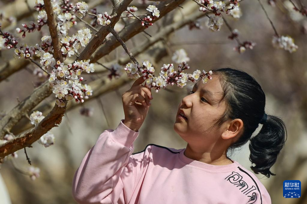 3月30日,在库车市牙哈镇托克乃村小白杏示范田,小朋友在杏园赏花。