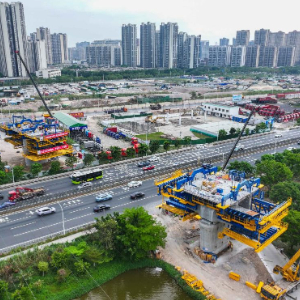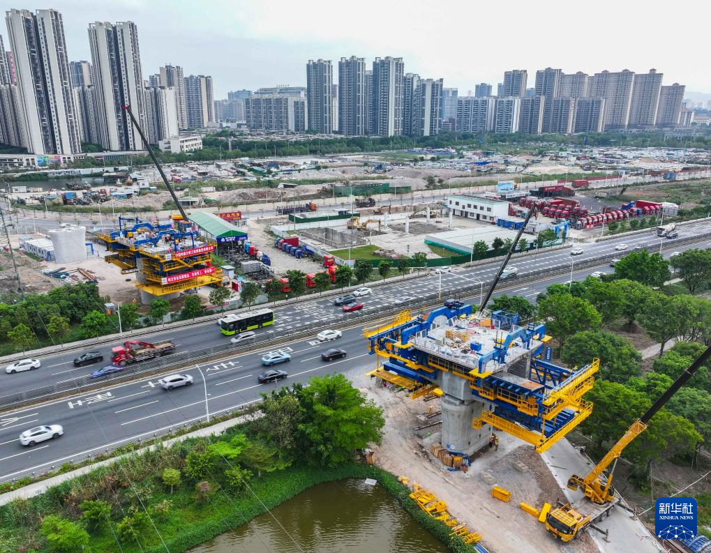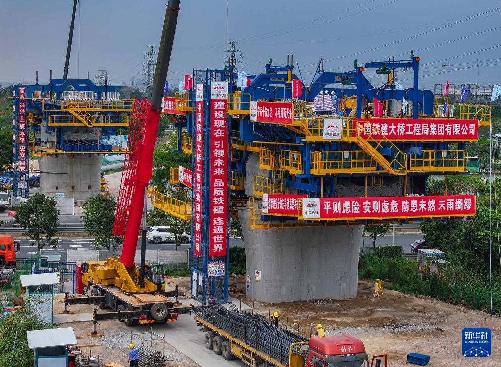 多功能悬臂智慧造桥机在深江铁路跨105国道沙溪特大桥上进行作业(3月31日摄,无人机照片)。