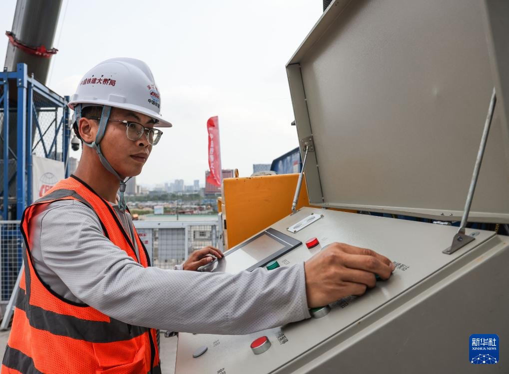 3月31日,技术人员在深江铁路跨105国道沙溪特大桥上调试多功能悬臂智慧造桥机操作台。