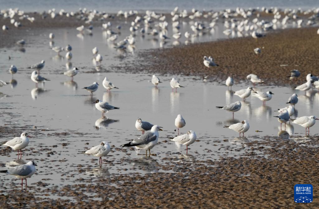 3月31日,一群水鸟在河北省秦皇岛市北戴河区沿海湿地觅食。