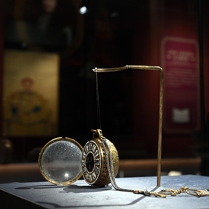 这是展出的故宫博物院藏铜镀金壳开光人物像怀表(4月1日摄)。
