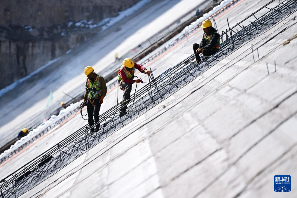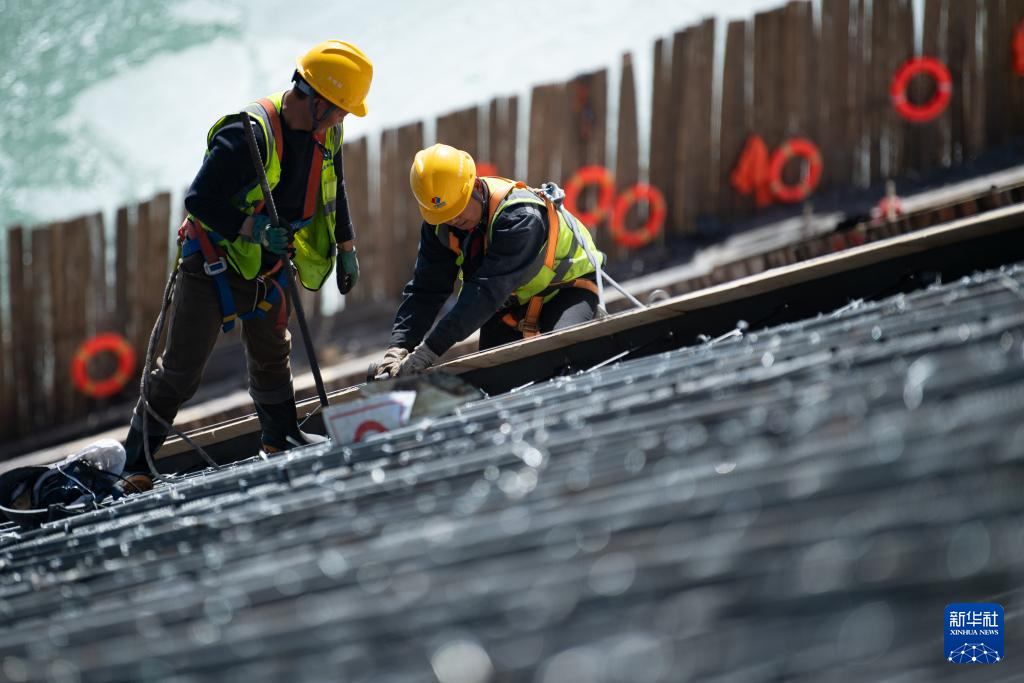 4月1日,玛尔挡水电站工作人员在坝体上施工。