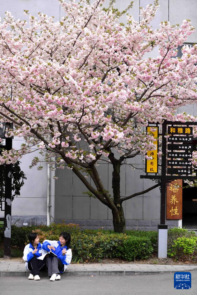 4月1日,两名学生在贵州省桐梓县第一中学校园内樱花树下交流。