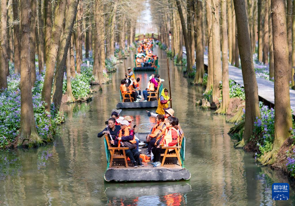 3月31日,游人在江苏省兴化市里下河国家湿地公园乘坐木筏游玩。