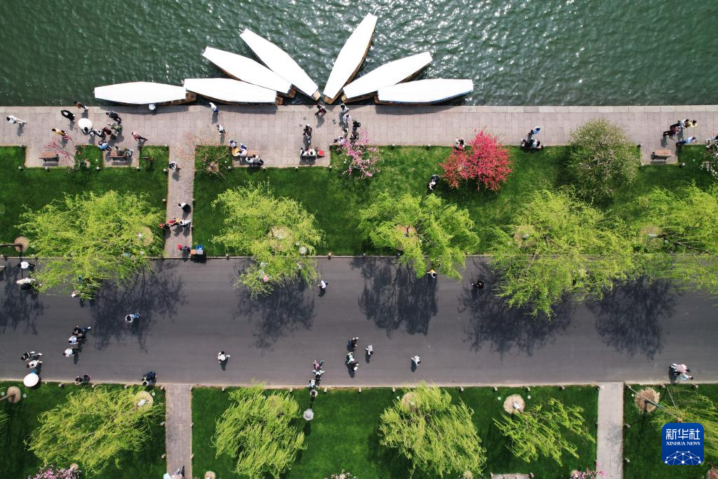 4月1日,游客在杭州西湖白堤上踏青赏花(无人机照片)。
