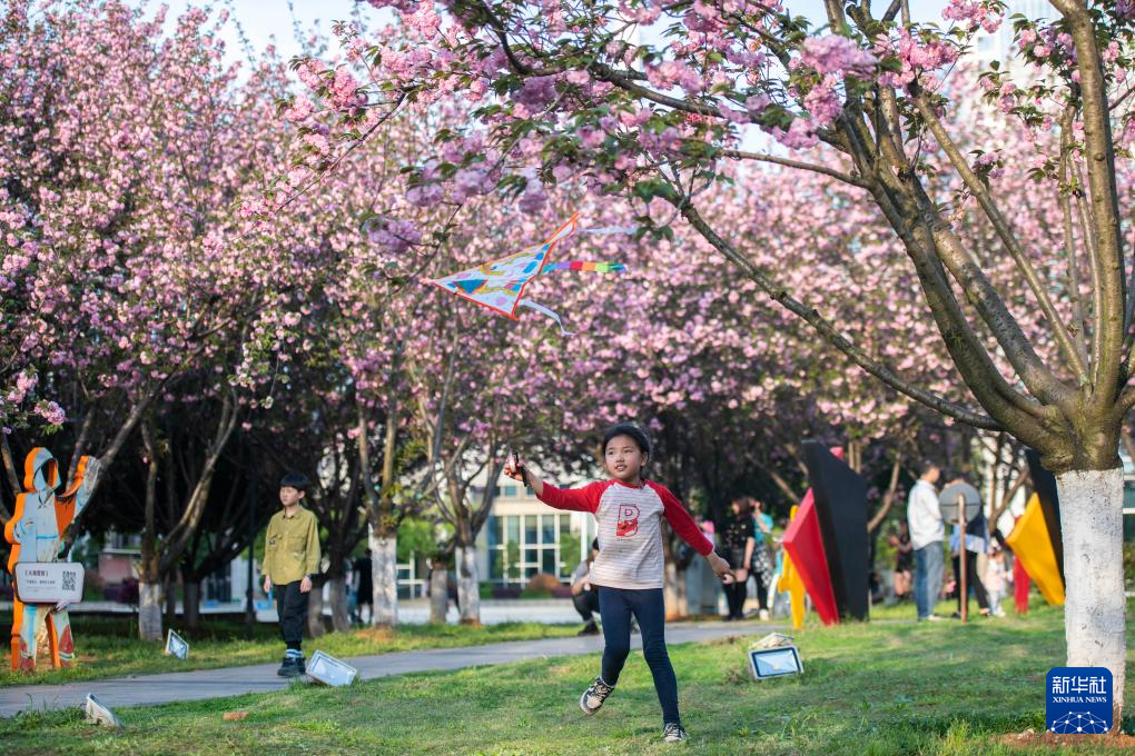 3月31日,湖南省娄底市体育公园樱花绽放,小朋友在放风筝。