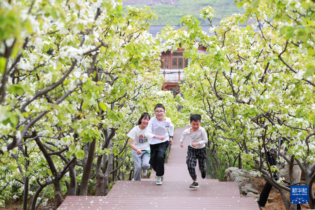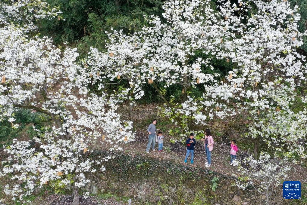 3月31日,浙江省温岭市城东街道乌龙岙村,游客在观赏梨花(无人机照片)。