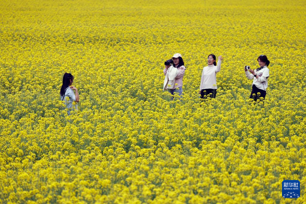 4月1日,游客在甘肃省陇南市武都区坪垭藏族乡的一处油菜花田赏花拍照。
