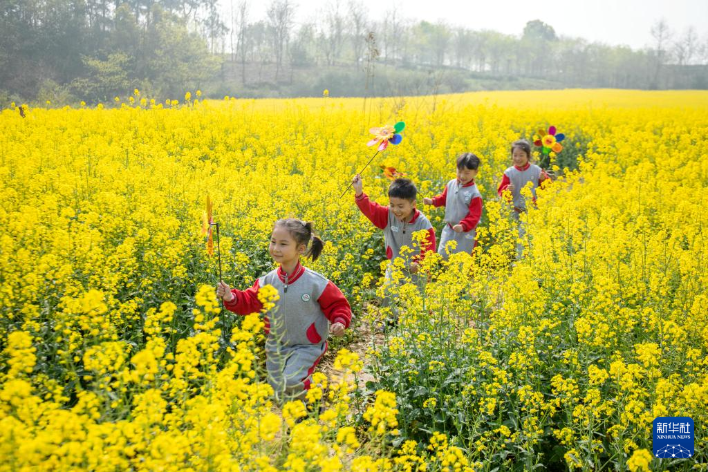 4月1日,浙江省湖州市长兴县泗安镇长岗岭村,小朋友在花田中奔跑。