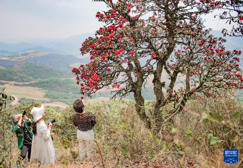 3月31日,云南省红河哈尼族彝族自治州蒙自市鸣鹫镇颇者村,游人在盛开的杜鹃花前拍照。