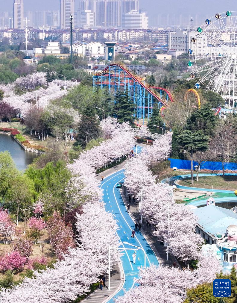 4月1日,游客在江苏省淮安市樱花园赏花游玩(无人机照片)。