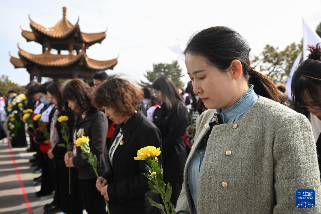 4月2日,在内蒙古生命礼赞园,人们肃立默哀。