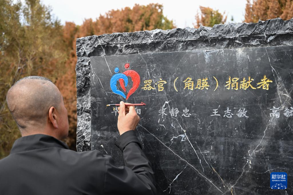 4月2日,捐献者家属在内蒙古生命礼赞园为遗体和人体器官捐献者的名字描金。