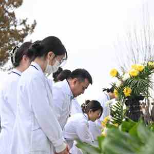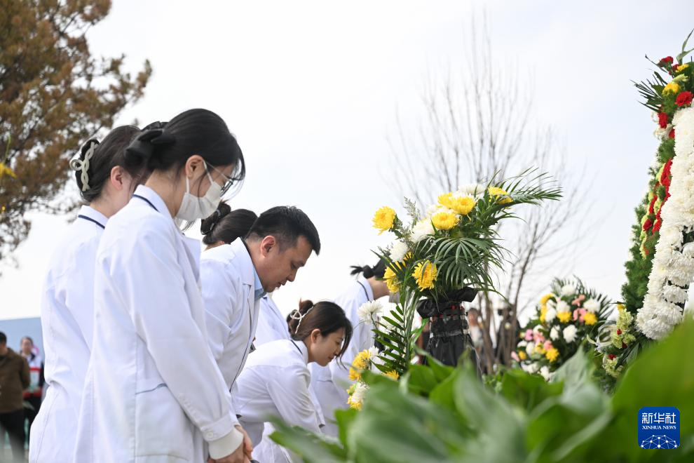 4月2日,医务人员代表在内蒙古生命礼赞园向遗体和人体器官捐献者敬献花篮。