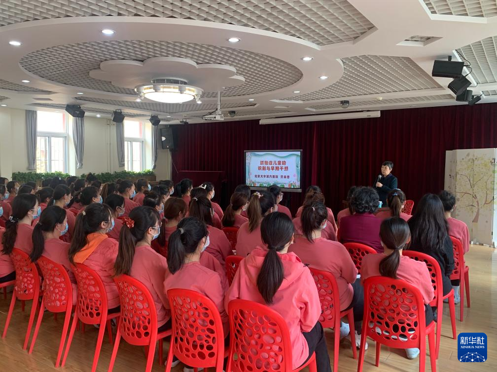 在北京大学医学部幼儿园,北京大学第六医院主任医师贾美香为幼儿园全体教师进行《孤独症儿童识别与早期干预》主题培训(2022年3月22日摄)。